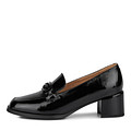 Классические черные туфли на каблуке с квадратным мысом и цепочкой. Материал верха — лаковая кожа спилка. Натуральный материал обеспечивает хорошую терморегуляцию и воздухопроницаемость, при этом отличается прочностью и обладает фактурой с глянцевым блеском. Стелька лаковых туфель выполнена из мягкой кожи шевро.