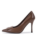 Эффектные кожаные туфли в трендовом коричневом цвете. Подкладка и стелька выполнены из мягкой натуральной кожи, что гарантирует идеальную посадку и комфортный воздухообмен. Изящный каблук высотой 95 мм визуально вытягивает силуэт. Модель дополнена лаконичным декором.