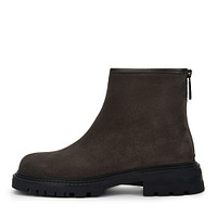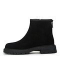 Минималистичные черные ботинки. Материал верха - бархатистый спилок. Подкладка и стелька выполнены из теплой натуральной шерсти. Модель надежно фиксируется молнией. Утолщенная резиновая подошва обеспечивает устойчивость на любой поверхности.