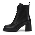 Эффектные черные ботильоны с акцентной шнуровкой. Натуральная кожа верха надежно защищает от влаги и ветра. Подкладка и стелька утеплены ворсином. Молния ускоряет процесс надевания обуви. Плотная резиновая подошва отличается прочностью и хорошей амортизацией ударной силы на стопы. Широкий каблук высотой 70 мм устойчив и грамотно распределяет нагрузку.