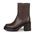 Трендовые коричневые ботильоны отлично подойдут для широких джинсов или брюк в пол. Высота устойчивого каблука компенсирована широкой платформой, а благодаря рисунку протектора улучшено сцепление с любой поверхностью. Модель выполнена из натуральной кожи, отполированной до полуглянцевого блеска.