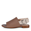 Удобная и стильная обувь для лета будет очень кстати в вашей коллекции. Сандалии выдержаны в нейтральном бежево-коричневом цвете и подойдут под большинство вещей из летнего гардероба. Пара полностью выполнена из натуральной кожи (верх, подкладка, стелька), имеет широкую союзку, открытые носок и пятку, почти незаметный, 2,1 см высотой, каблук. Задник в виде широкого ремешка украшен пряжкой-застежкой.