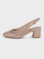 Стильные красивые туфли для летних образов в деловом стиле, также прекрасно смотрятся с платьями и костюмами для торжественных выходов. Модель выполнена из натуральной кожи рыжего оттенка, имеет закругленный закрытый носок, открытую пятку и застежку-пряжку. В дизайне предусмотрена частичная узорная перфорация. Устойчивый квадратный каблук 5,7 см.