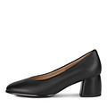 Черные туфли-лодочки сделаны из мягкой кожи шевро, из этого же материала изготовлена подкладка, что обеспечивает максимальный комфорт. Изюминка модели — устойчивый каблук необычной выпуклой формы. Высота каблука — 57 мм, это — классический офисный вариант, но туфли можно носить не только со строгими костюмами, но и с менее формальной одеждой.