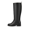 Чёрные сапоги на небольшом каблуке с петлёй на заднике изготовили из кожи из спилка. Материал подкладки - ворсин, а стельки - натуральная шерсть. Подошва из резины обеспечивает надёжное сцепление с любой поверхностью.