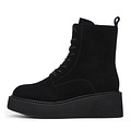 Актуальные черные ботинки на платформе. Верх выполнен из женственного велюра. Подкладка и стелька утеплены шерстью для оптимальной терморегуляции на улице и в помещении. Высокая подошва из материала ТЭП отличается легкостью, морозоустойчивостью и хорошим сцеплением с поверхностью. Модель фиксируется шнуровкой и удобно застегивается на молнию.