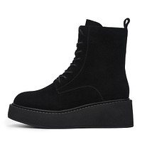 Актуальные черные ботинки на платформе. Верх выполнен из гладкой натуральной кожи. Подкладка и стелька утеплены шерстью для оптимальной терморегуляции на улице и в помещении. Высокая подошва из материала ТЭП отличается легкостью, морозоустойчивостью и хорошим сцеплением с поверхностью. Модель фиксируется шнуровкой и удобно застегивается на молнию.