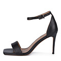 Изящные кожаные черные босоножки. Широкие ремешки с подкладкой из нежной кожи шевро бережно фиксируют пару на ноге. Стелька также изготовлена из шевро. Каблук высотой 93 мм формирует оптимальное распределение нагрузки по стопе.  Модель с застежкой на классический замок с пряжкой.
