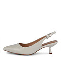 Изящные молочные кожаные туфли с открытой пяткой. Комфорт стоп и идеальную посадку обеспечивают подкладка и стелька из нежной кожи шевро. Фигурный каблук высотой 55 мм формирует оптимальное распределение нагрузки по стопе.  Трендовая модель "слингбэк" гармонично дополнит образы с брюками, платьями и воздушными юбками.