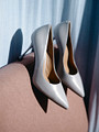 Элегантные туфли-лодочки светло-серого оттенка. Модель изготовлена из нежной кожи шевро, которая адаптируется под форму стопы. Гибкая подошва из тунита отличается прочностью. Тонкий устойчивый каблук высотой 9,5 визуально вытягивает силуэт.