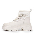 Эффектные молочные ботинки из нейлона и кожи из спилка. Пара утеплена натуральной шерстью, надежно защищающей стопы от холода. Высокая резиновая подошва обеспечивает устойчивость на любых покрытиях. Шнуровка хорошо фиксирует пару на ногах.