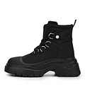 Эффектные черные ботинки из нейлона и кожи из спилка. Пара утеплена натуральной шерстью, надежно защищающей стопы от холода. Высокая резиновая подошва обеспечивает устойчивость на любых покрытиях. Шнуровка хорошо фиксирует пару на ногах.