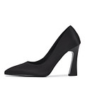 Сильные туфли-лодочки в классическом черном оттенке. Верх выполнен из текстиля с деликатным блеском, внутренняя отделка из натуральной кожи. Гибкая тунитовая подошва отличается прочностью. Устойчивый фигурный каблук высотой 10 см грамотно распределяет нагрузку на стопы.