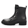 Стильные трендовые ботинки предназначены для повседневного ношения в сезон весна-осень. Модель выполнена в несколько грубоватом дизайне, из натуральной кожи черного цвета, утеплена внутри ворсином (подкладка и стелька). Спереди три декоративных ремешка на металлических люверсах. Застежка на молнии, есть резинка. Подошва ТЭП не скользит, удобный квадратный каблук 4 см.