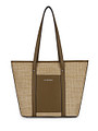 Лаконичная сумка-шопер с отделкой, стилизованной под плетеный джут. Вместительная пляжная сумка дополнена удобными длинными ручками и внутренним карманом. Застежка на молнию в тон.