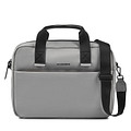 Минималистичный серый портфель из искусственной кожи. Подкладка изготовлена из прочного текстиля. Портфель вмещает документы формата А4 и ноутбук среднего размера. Детали: застежка на молнию, съемный плечевой ремень, практичные карманы для мелочей.