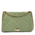 Миниатюрная зеленая сумка со стеганой фактурой. Верх выполнен из матовой искусственной кожи, подкладка изготовлена из прочного текстиля. Модель с одним вместительным отделением и карманами для мелочей. Длинный плечевой ремень-цепочка и удобный поворотный замок.