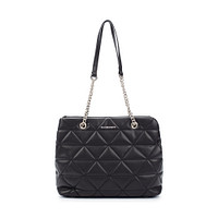 Геометричная бежевая сумка-тоут с трендовой отстрочкой и акцентными ручками с цепочкой. Модель с двумя вместительными отделениями и карманами для мелочей. Застежка на молнию. Сумка отлично дополнит повседневные и вечерние образы.