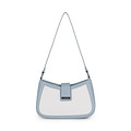 Миниатюрная бело-голубая сумка-багет. Верх выполнен из фактурной искусственной кожи, подкладка изготовлена из прочного текстиля. Застежка на молнию и магнитный замок. Лаконичный дизайн дополняет серебристая фурнитура.