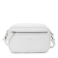 Кросс-боди сумка через плечо из экокожи с молнией и магнитом. Универсальная модель с регулируемым ремешком, удобная для носки на плечо или в руках. Стильная сумка для работы, учебы и вечерних выходов. Белая сумочка с серебристой фурнитурой и тиснением логотипа. Внутренние карманы для телефона, молнии и дополнительные внешние карманы. Подходит для всех сезонов.