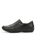 Минималистичные черные мокасины в стиле ретро. Верх комбинирует гладкую и текстурированные фактуры натуральной и искусственной кожи. Подкладка и стелька обеспечивают комфорт стоп в процессе носки. Объемная подошва из полиуретана отлично амортизирует нагрузку на стопы. Модель фиксируется боковыми молниями и резинкой.