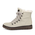 Лаконичные бежевые ботинки с высокой шнуровкой. Верх выполнен из мягкой искусственной кожи нового поколения, устойчивой к истиранию. Голенище декорировано текстильной имитацией меха. Подкладка и стелька обеспечивают комфорт стоп в прохладную погоду. Высокая резиновая подошва с выраженными протекторами отличается устойчивостью на любых покрытиях. Модель удобно застегивается на молнию.